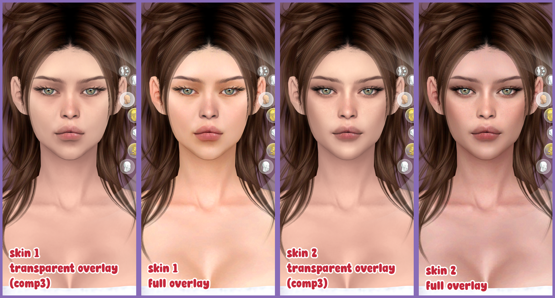 Lovingly crafted by the exceptionally talented artist Oneofthesedays, Skin 1 is now compatible with thepancake's Colour Slider mod, so you can have more colour options for your sims, along with a transparent overlay version (comp3) which has also been added for those who requested it.